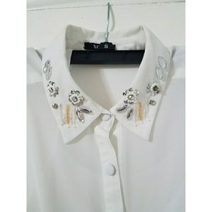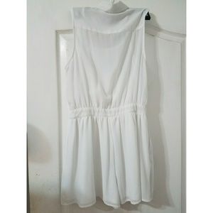 White romper more on the casual/dressy side, it is sheer but has a slip on the inside, and beautiful embroidered detail on the collar all stones are intact, only worn once was missing a button since i bought it.