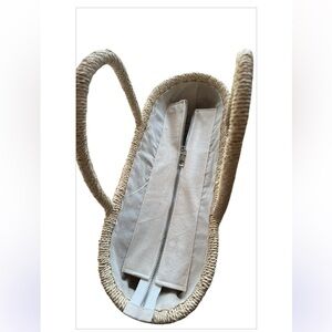 White & yellow boho pattern straw beach or tote bag. Large enough for a towel & other beach necessities this bag has secure top zipper & leather snap flap closure!