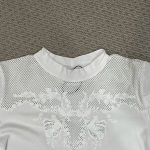 Chic white top with mesh front from Zara. Has lightly puffed sleeve. Stylish design.