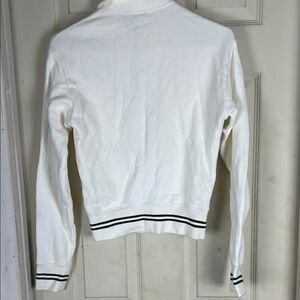 This white zip-up sweater features a subtle textured fabric, offering a stylish and comfortable fit. The standing collar adds a touch of elegance, while the ribbed hem provides a snug finish. Ideal for casual outings, this sweater combines functionality with a modern look. 100% cotton