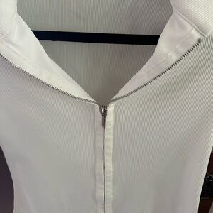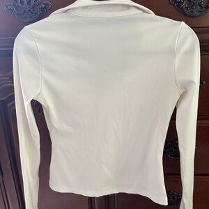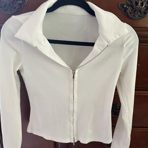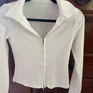 Stylish white jacket with a zip-up front and collared design. Perfect for layering.