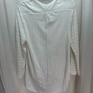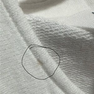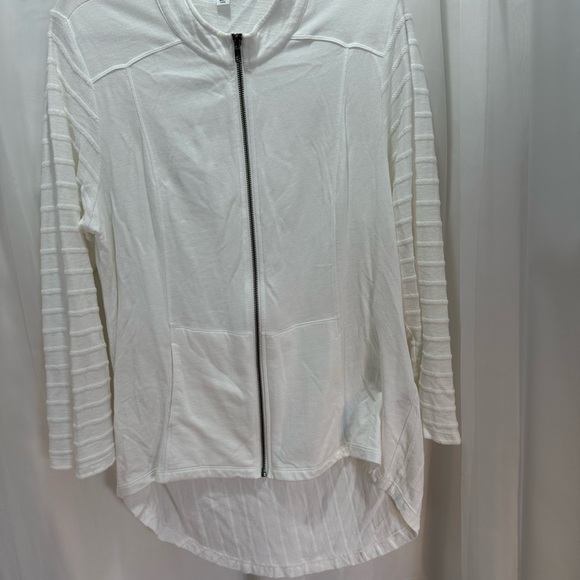 Stylish white zip-up jacket with textured sleeves. Perfect for layering. Small discoloration on neckline- see pictures