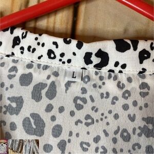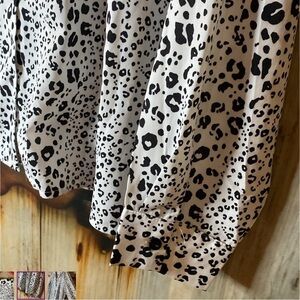 This stylish button down shirt features a striking black abstract pattern on a white base, complemented by long sleeves. The lightweight fabric makes it perfect for casual or semi-formal occasions, offering both comfort and a bold fashion statement. Very soft.