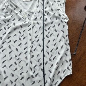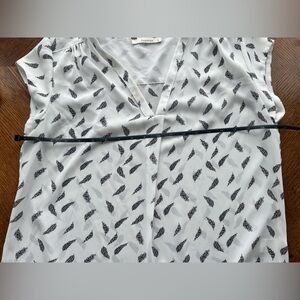 White and Black Feather Patterned Women's V-Neck Short Sleeve Blouse Sz M