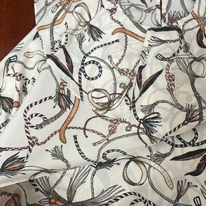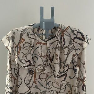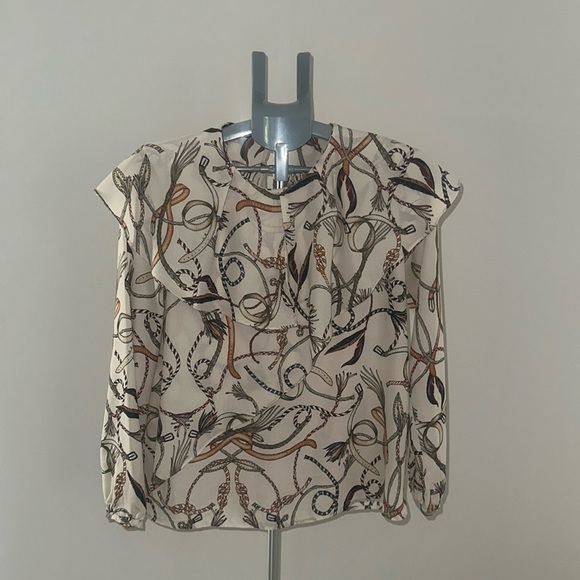 Stylish long sleeve blouse with a unique black pattern on a white background. Features a high neckline and puffed shoulders.