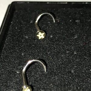These are 18 gauge C-shaped nose rings. They each have a Design on them that is 3mm round. The nose ring design is White and Black Pentagram. This nose rings is 316-L surgical steel.