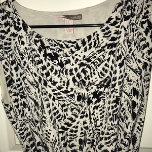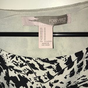 white in color, black floraly/spotty pattern, short mini, scoop neck line, cinched at the waist. There was once a black rope that sat in the belt loops, but i️t has been removed. The belt loops remain on the dress if you decide you would like to add a belt!