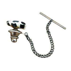 White and Black Spotted Pig Tie Tack - 3 Inches with Chain - Good Condition