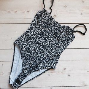 winie black & white speckled printed cotton spandex jersey bra bodysuit. Bustier style top with adjustable shoulder straps & snap crotch closure.