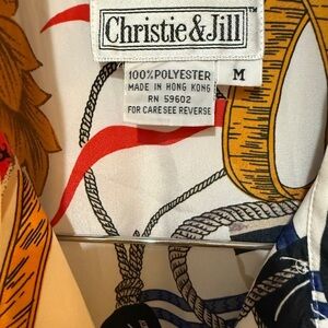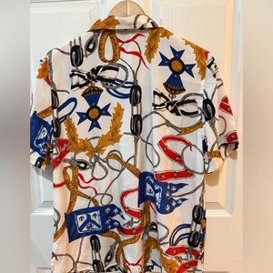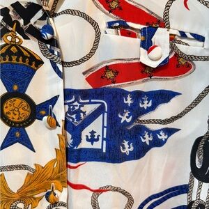 This top features a striking artistic print with abstract rope motifs in blue and white, offering a nautical-inspired look. Made from lightweight material, it is perfect for casual wear, ensuring comfort and style. The bold design makes it a standout piece in any wardrobe. sailing boating travel London British