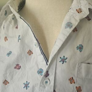 This casual button-down shirt features a crisp white base adorned with a subtle blue pattern, perfect for a relaxed yet stylish look. Made from 100% cotton, it offers comfort and breathability for everyday wear. Ideal for casual outings or laid-back gatherings.