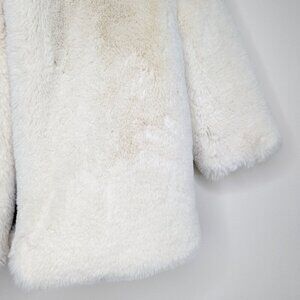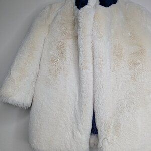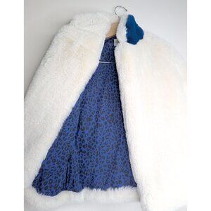 Pretty white faux fur jacket with bright blue collar and removeable back sash. 3/4 length dolman sleeves and open front (no zipper or buttons). Pretty contrasting blue lining.