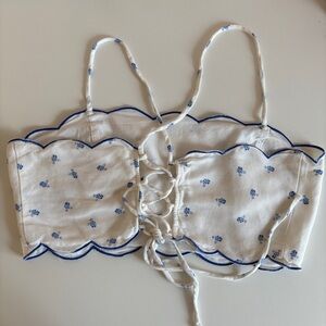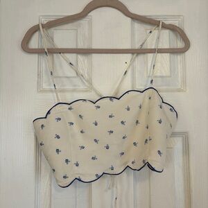Chic white crop top with blue floral pattern. Features scalloped edges and thin straps.