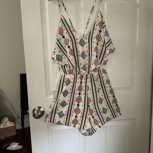 This jumpsuit features a white base with blue vertical stripes and floral accents, complemented by thin spaghetti straps and a V-neckline. The cinched waist creates a flattering silhouette, while the short length and airy design make it perfect for warm weather.