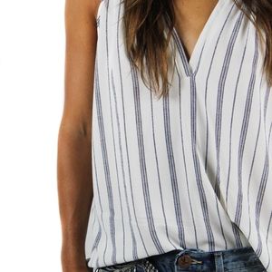 Our Castaway Top is an easy lightweight summer style with a white and black stripe print. It can be paired with our Castaway short for a two piece set look or styled by itself separately!