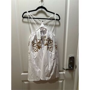 Elegant white mini dress with brown floral accents. Perfect for summer outings.