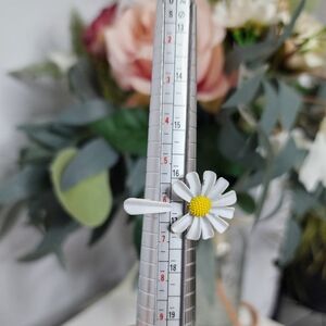 Elegant daisy ring with white petals and a gold center. Perfect for adding a floral touch to any outfit. Open ring, slightly adjustable. Please see pictures for the sizing.