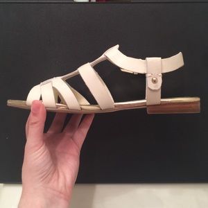 Worn twice. Reasonable offers only. Flat white faux leather sandal with gold sole. 🚫NO TRADES🚫