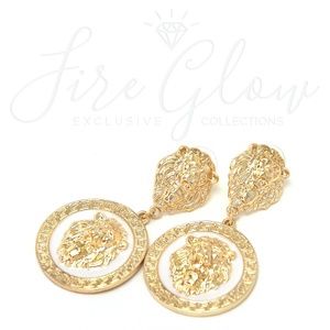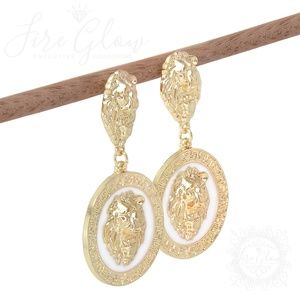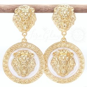 Beautiful gold tone setting frames this gold tone Lion Head set in a white background, with a second lion head on the post. A gorgeous accessory for both a classy or casual look. Pair with an elegant dress for a night out for that Gucci or Versace look or dress them down for the office. Our White and Gold Tone Framed Lion Earrings are a stunning addition to everyone's collection.