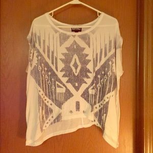 Long on the sides and fits loosely, can be worn off the shoulder, too!