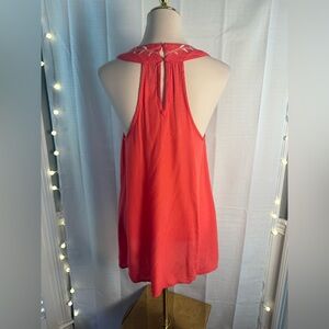 This relaxed tank top features a sleeveless design with a flowy silhouette, perfect for casual comfort. The white and orange color scheme is complemented by intricate embellishments along the hem, adding a touch of elegance. Ideal for warm days, this top combines style with ease.