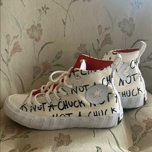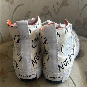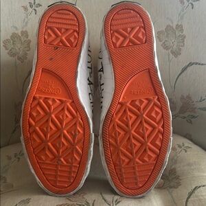 These high-top Chuck sneakers boast a striking white and orange color scheme, perfect for adding a pop of color to any outfit. Designed with a classic basketball sneaker style, they feature a durable canvas upper and a sturdy rubber sole for optimal comfort and support. Ideal for both casual and athletic wear, these sneakers are a versatile addition to any shoe collection. Size 6 gently used