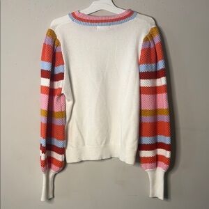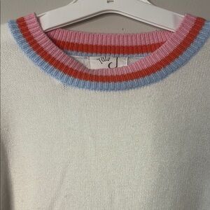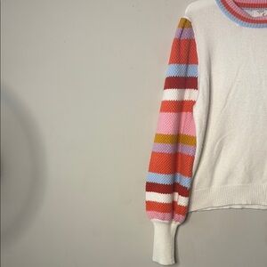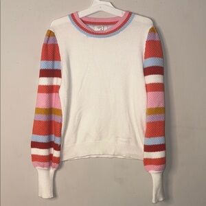 White and Pink Crew Neck Sweater with Striped Sleeves