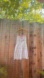 Charming white dress with pink floral patterns featuring a drop basque waist, knee length hemline, a tie-front detail and adjustable straps. Brand is “Sienna sky” - free people tagged for exposure