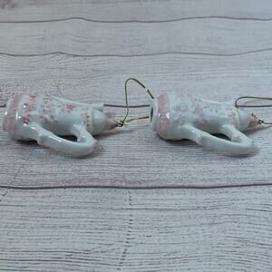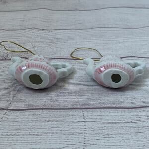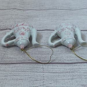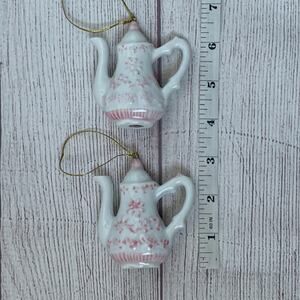 White and pink floral porcelain teapot ornaments. This set of 2 mini ornaments are white with a pink floral design on both sides. There is a hole in the bottom of the ornaments and a thin gold string at the top for hanging. They have some variations from one another and manufacturing imperfections in the application of the pink detail. They are pre-owned and in great condition. No chips or cracks.