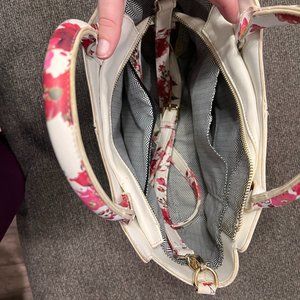 This white and pink floral purse has a long strap that comes with it and two handles for easy carrying. It is still in great condition.