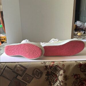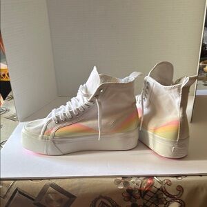 These sneakers boast a modern high-top silhouette with a clean white and pink color scheme. The platform sole adds a touch of height, while the leather-like upper ensures a sleek, contemporary look. Perfect for adding a fashionable edge to any casual outfit.