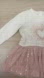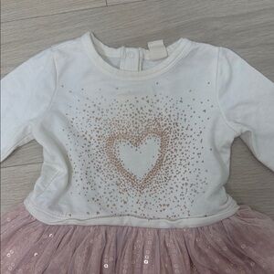 Adorable long sleeve dress featuring a white top with a heart design and a pink sequin skirt.