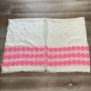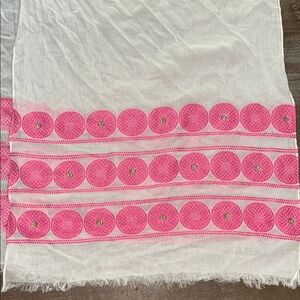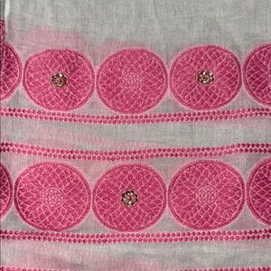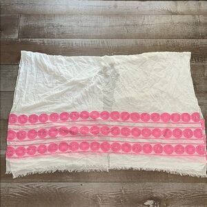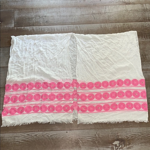 NWOT. Bought at a URBN sample sale. No tags. But appears to be a white cotton blend gauze with pink embroidery and silver sewn on sequins in flower shapes. Measures 42” wide. Sides are not tacked, so completely open. Full length measures about 60”, so 30” when worn. Cute cover up or paired with jeans!