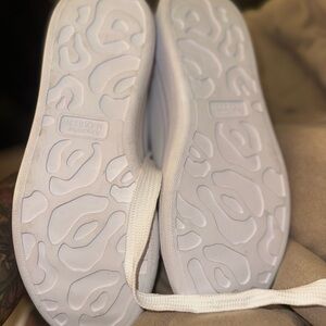 Stylish white sneakers featuring subtle pink accents. Perfect for casual wear.
