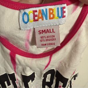 This fitted camisole showcases a vibrant pink splash pattern on a white base, offering a striking and casual look. The adjustable spaghetti straps ensure a comfortable fit, perfect for beach outings or relaxed days. Bold black text across the chest adds a unique touch to this stylish top.