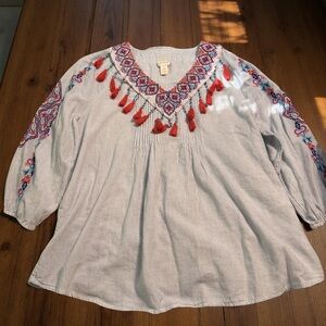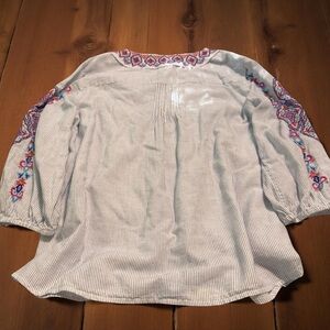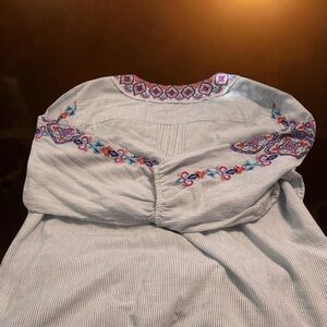 Chico’s Bohemian Dream. ❤️This stylish blouse features intricate embroidery in white and purple, offering a chic and sophisticated look. The V-neck design is complemented by embroidered details on the sleeves, adding a touch of elegance. Perfect for both casual and formal occasions, this blouse is a versatile addition to any wardrobe. 24 inches, pit to pit, 26 inches in length. This blouse, top, is very soft and the embroidery is beautiful in person. The back of the neck is embroidered, it’s pretty with a summery bun. ❤️ This is very comfy and casual but with a snazzy pair of pants it can be dressed up.