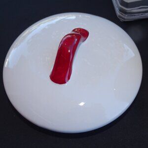 Here is a very cute new white and red cookie jar with a old fashioned red pick up truck painted on the front. It measures 6" x6" without the lid, The lid has a tight seal for freshness.