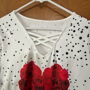 This top showcases a bold red heart graphic on a white base, complemented by red accents along the sleeves and black polka dots. Its relaxed fit and graphic design make it a standout piece for casual wear.