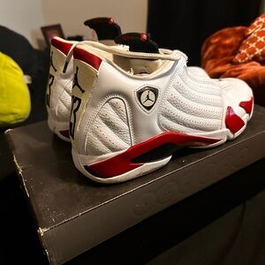 Classic Jordan Air Retro 14 sneakers. Features a bold white and varsity red color scheme. Ideal for both sports and casual outings. Worn maybe 5 times