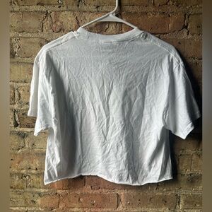 Chic crop top with bold red letter design. Ideal for casual wear.