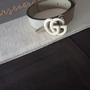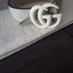 Stylish belt featuring a white and tan design. Includes a distinctive logo buckle.