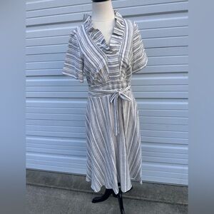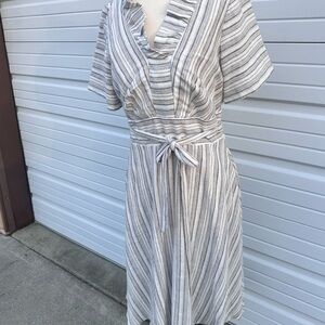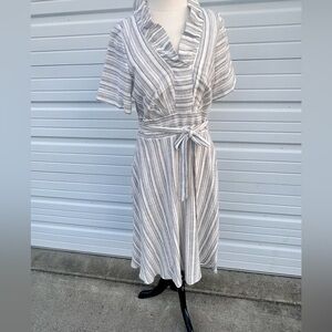 White and Tan Wrap Midi Dress with Cowl Neck and Flutter Sleeves size 10