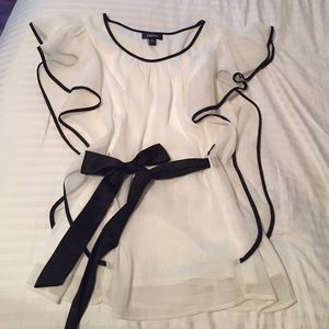 BRAND NEW white chiffon top with black silk outlining the sleeves and a black silk sash. The material will keep you cool and stylish for work. The flowy chiffon sleeves fall beautifully on any body type. Selling for the reason that I bought a size too big.