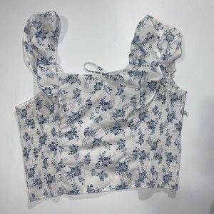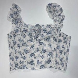 White and blue ruffle shoulder floral printed womens crop top size xl