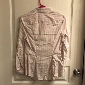 White button down with thin burgundy strips. You can dress this up and wear it to the office, or can dress this down and wear under a sweater with a cute statement necklace!