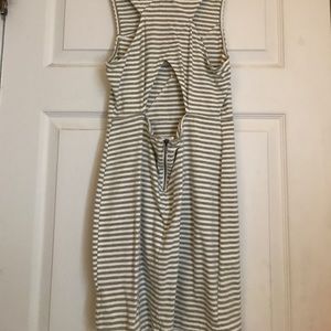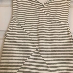 White and gray striped body con dress with key hole back. 94% cotton 4% elastane