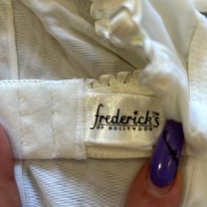 Fredericks of Hollywood white and ivory white trimed lingerie, lightly used (once) has adjustable straps, modest cups (soft cups) with underwire, size 34 back but fits a variety of sizes. Will potentially fit a full 34 B and up. Wedding/honeymoon wear. Classy look with corset laces in the back.