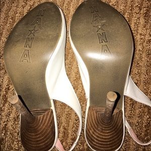 Na*Na white slingback peeptoe pumps with two tone pink butterflies on front and stacked 4" heel. Minimal wear on white leather just under heel area. Size 7.