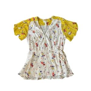 684-White and yellow floral print wrap top with short sleeves and tie waist #floralprint #anthropologie