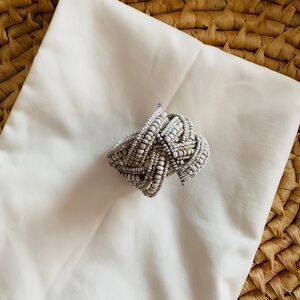 Beaded and made with wire, this is an off white cuff wrap bracelet. Not all the beads are bright white, kind of a mixed coloring.